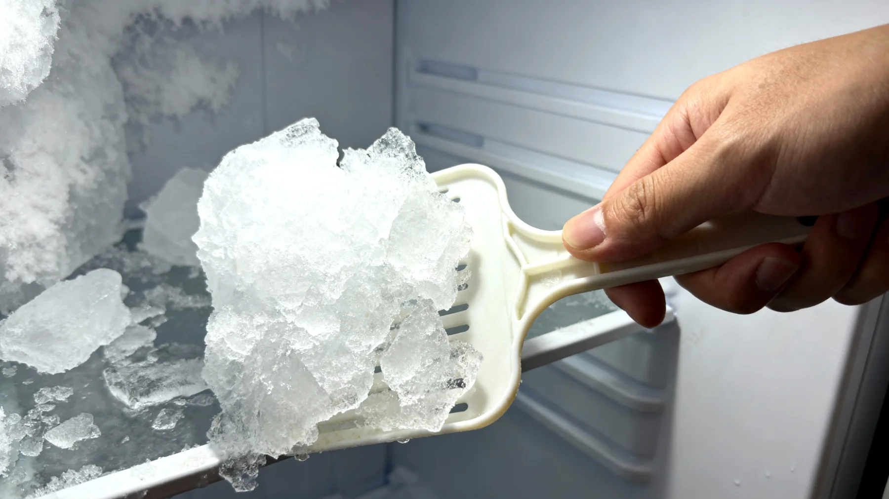 A questo punto molti commettono un errore classico: afferrare un coltello o un oggetto appuntito per staccare i blocchi di ghiaccio più spessi. È una pratica fortemente sconsigliata da tutti i produttori. Anche un piccolo foro nella serpentina del circuito refrigerante può causare la fuoriuscita del gas refrigerante e rendere l’apparecchio completamente inutilizzabile.