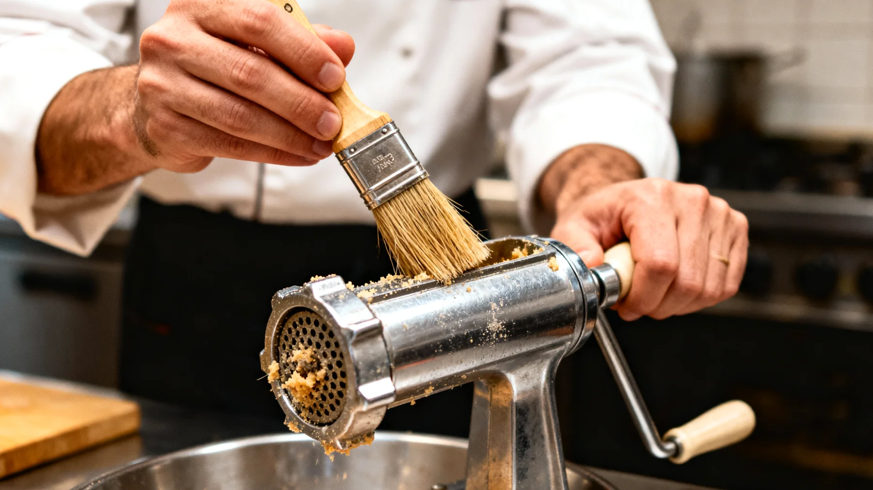 Il disco del passaverdure, con i suoi fori calibrati, funziona esattamente come un filtro industriale. Nella trasformazione alimentare, i filtri a microfori si puliscono efficacemente solo attraverso strumenti sottili e specifici. Uno spazzolino per unghie in silicone rappresenta uno degli alleati più efficaci: le setole rigide riescono a penetrare nei fori senza graffiare il metallo.